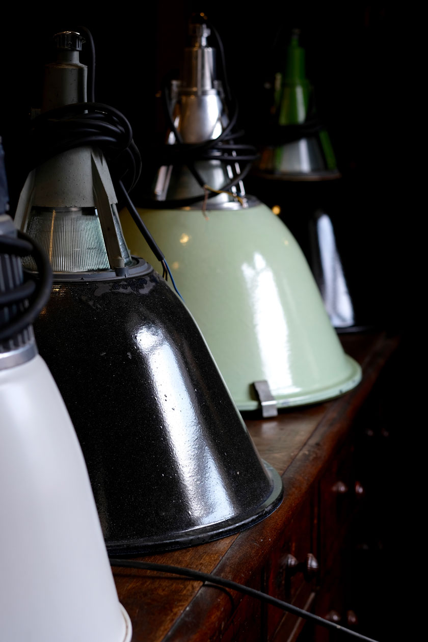 Aber auch alte Fabrikleuchten haben es dem Tischler angetan, egal ob aus alten Industrieanlagen, Militärstützpunkten oder Krankenhäusern. In seiner Werkstatt arbeitet er sie mit Liebe zum Detail auf, ohne ihnen die authentische Ausstrahlung zu nehmen.